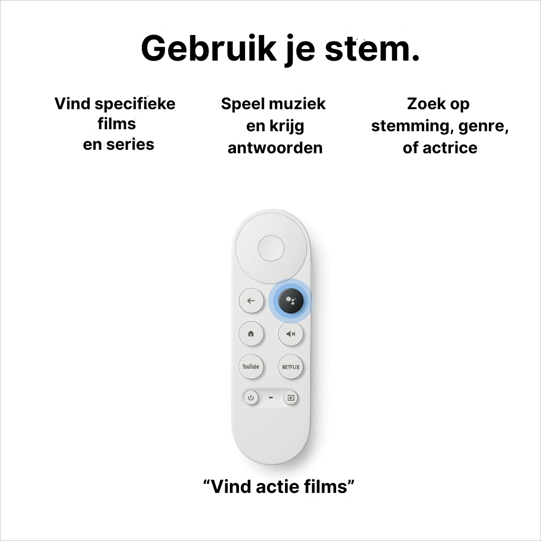 De meegeleverde afstandsbediening maakt de bediening nog eenvoudiger. Je kunt zoeken op titel, genre, stemming of acteur met behulp van de spraakfunctie via de ingebouwde Google Assistent. Zo vind je snel wat je zoekt, zonder te hoeven typen.